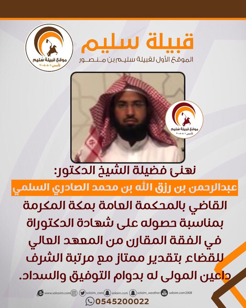 س ـلــيــم بــــن مـنـصــور On Twitter تهنئة لفضيلة الشيخ الدكتور عبدالرحمن بن رزق الله محمد الصادري السلمي القاضي بالمحكمة العامة بمكة المكرمة Alsadri Https T Co Xfjvisrmeg