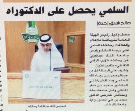 صالح شبرق On Twitter R Als0lami أبارك للزميل العزيز رجاء الله السلمي حصولة على درجة الدكتوراة من جامعة الملك عبدالعزيز بجدة بتقدير ممتاز