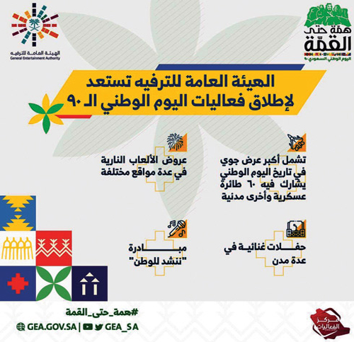 كيف تستعد المملكة للاحتفال باليوم الوطنى السعودى الـ90 هيئة الترفيه ترفع شعار همة حتى القمة لإطلاق فعاليات كرنفالية الأربعاء 60 طائرة تشارك فى أضخم عرض جوى والسوشيال ميديا تدشن مبادرة ننشد للوطن