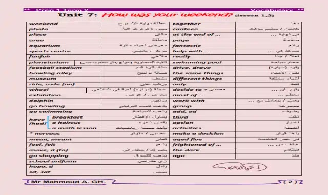 مذكرة كلمات منهج اللغة الانجليزية للصف الاول الاعدادى الترم الثانى 2020 اعداد مستر محمود ابو غنيمة موقع درس انجليزي